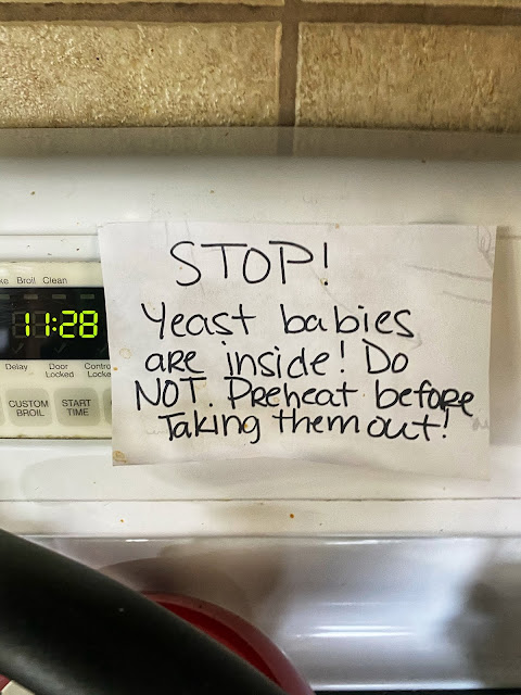 Shawn decided last week that maybe it would be a good idea to start a sourdough bread starter. It's so much work but it's been fun. I hope it all works out and we get delicious bread out of it. Today was the first day that we had to deal with it twice in one day. For some reason, unless we have a ton of company over, my kitchen is fairly chilly so we read that in the oven with the light on is a great place for the sourdough starter to sit. I have a really bad habit of not checking inside the oven before preheating, so I left myself a little note, to remind myself not to kill our starter.